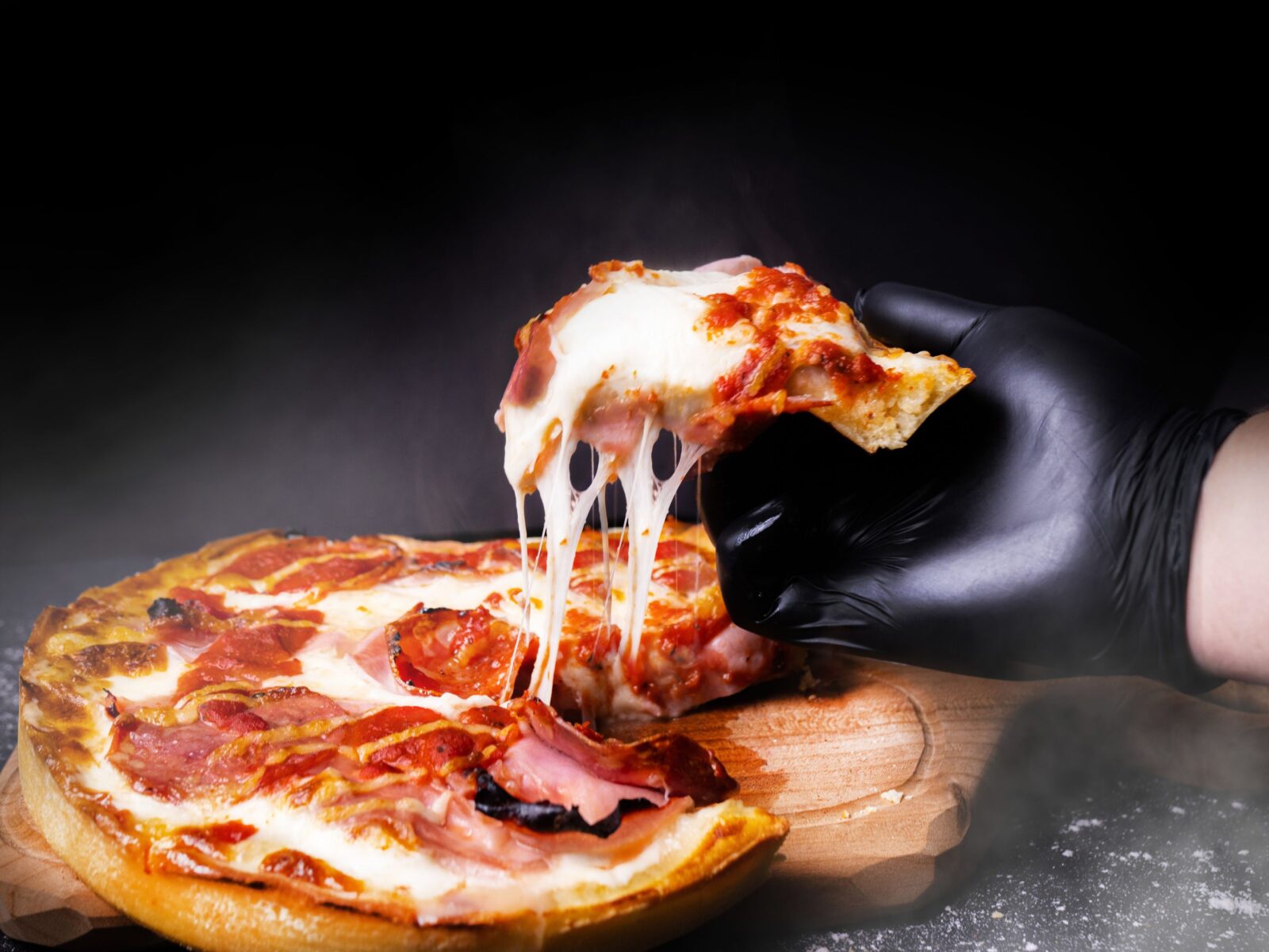 Preparat in stil DEEP DISH, pentru 2 persoane.Aluat cu maia, mozzarella Fior di Latte, salam Napoli Dolce, proschutto Cotto, sos de rosii facut in casa , usturoi-800g